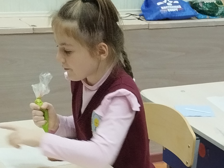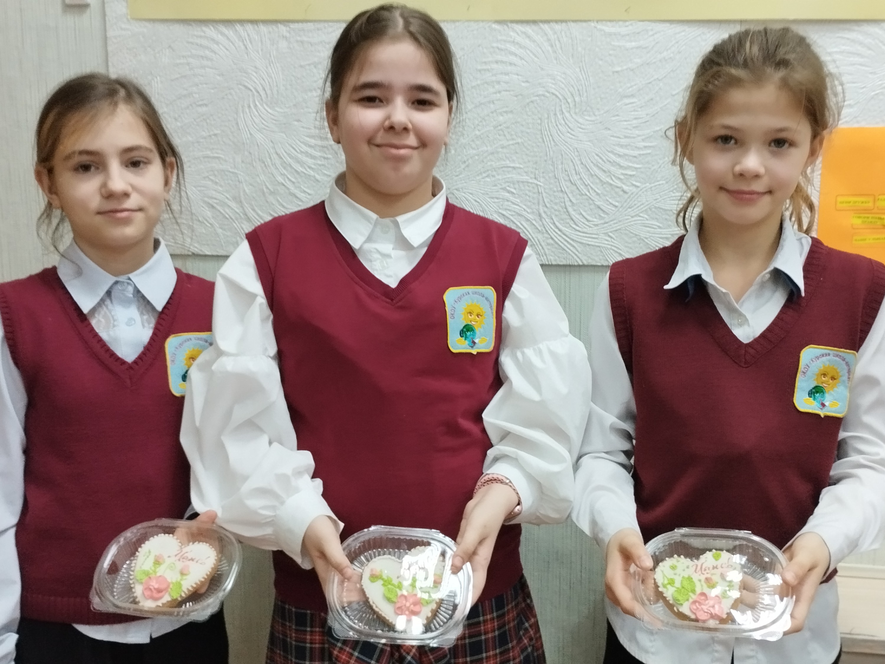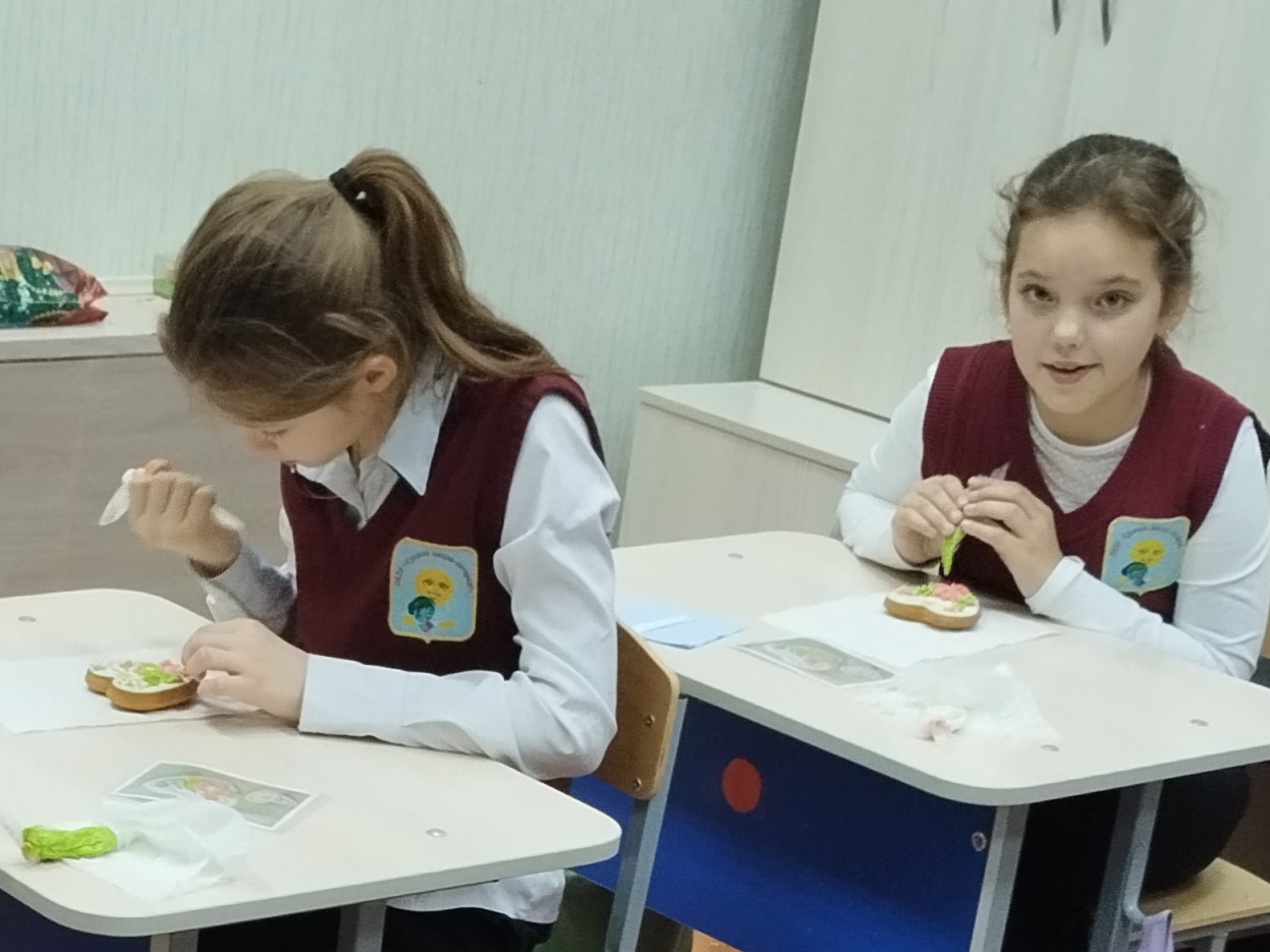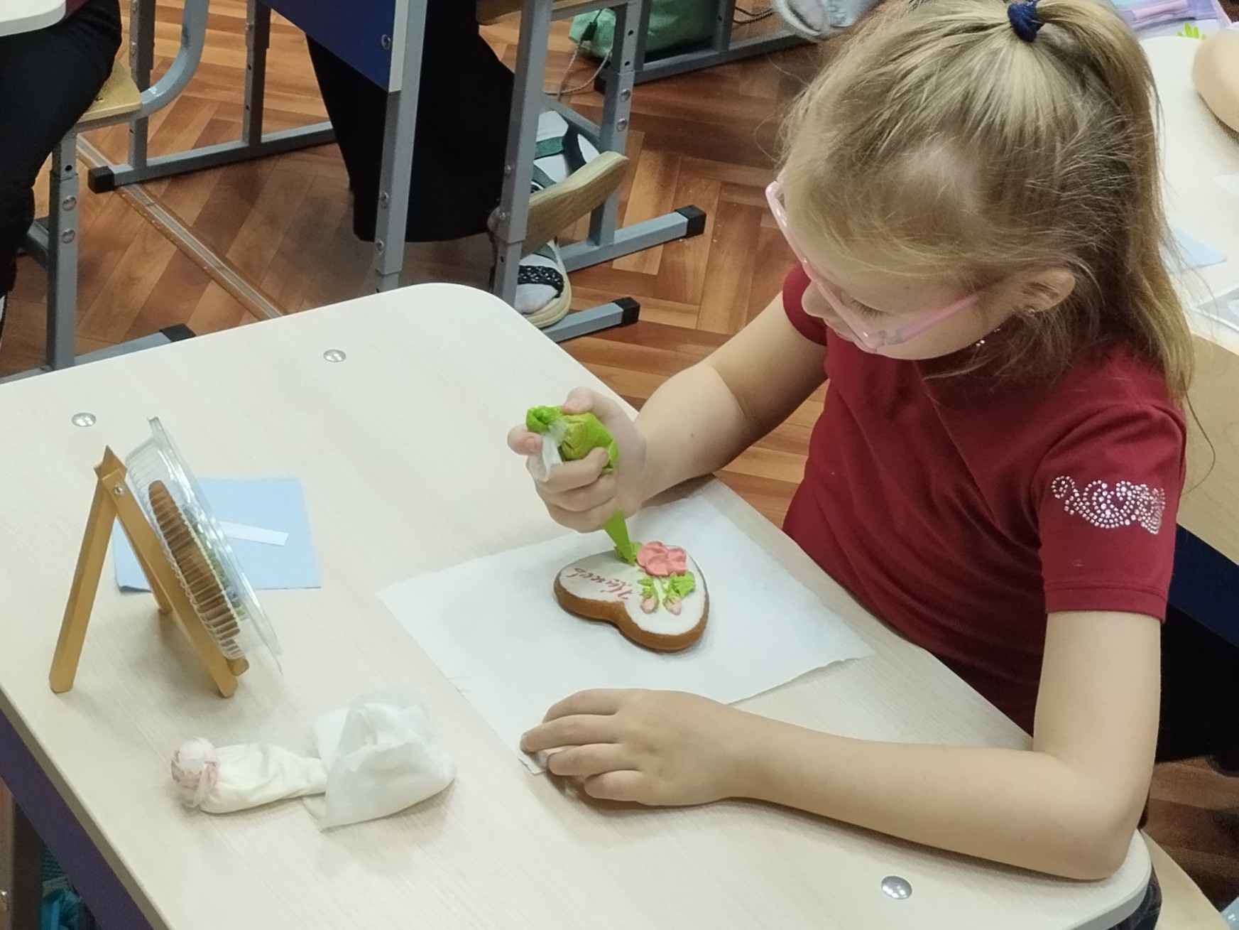Во втором мастер классе приняли участие обучающиеся 1 дополнительного А и 4А классов. Сначала ребята потренировались на маленьких пробных пряничках, затем им предложили попробовать их на вкус. После этого начался творческий процесс по росписи подарочных пряников для мам.