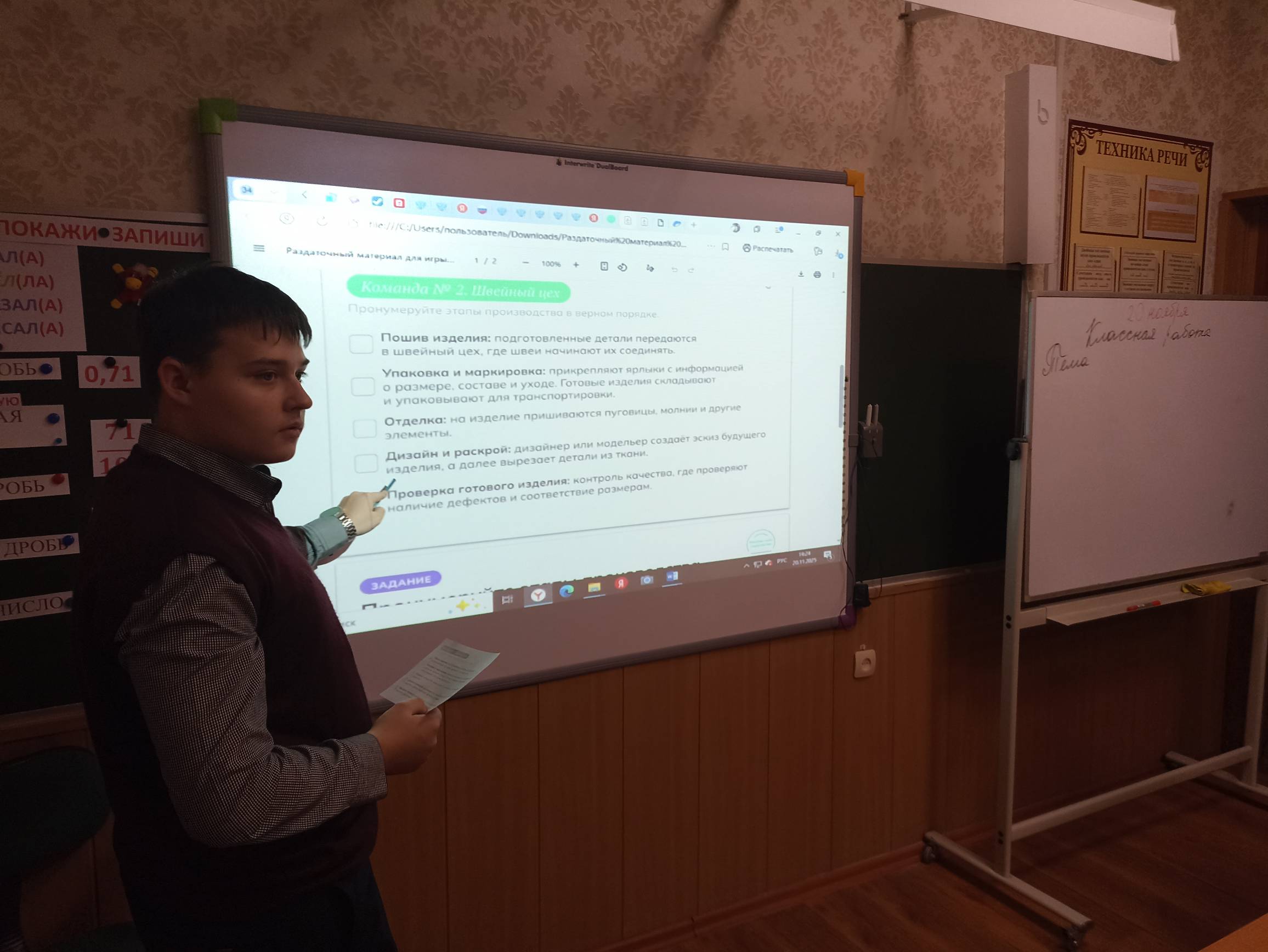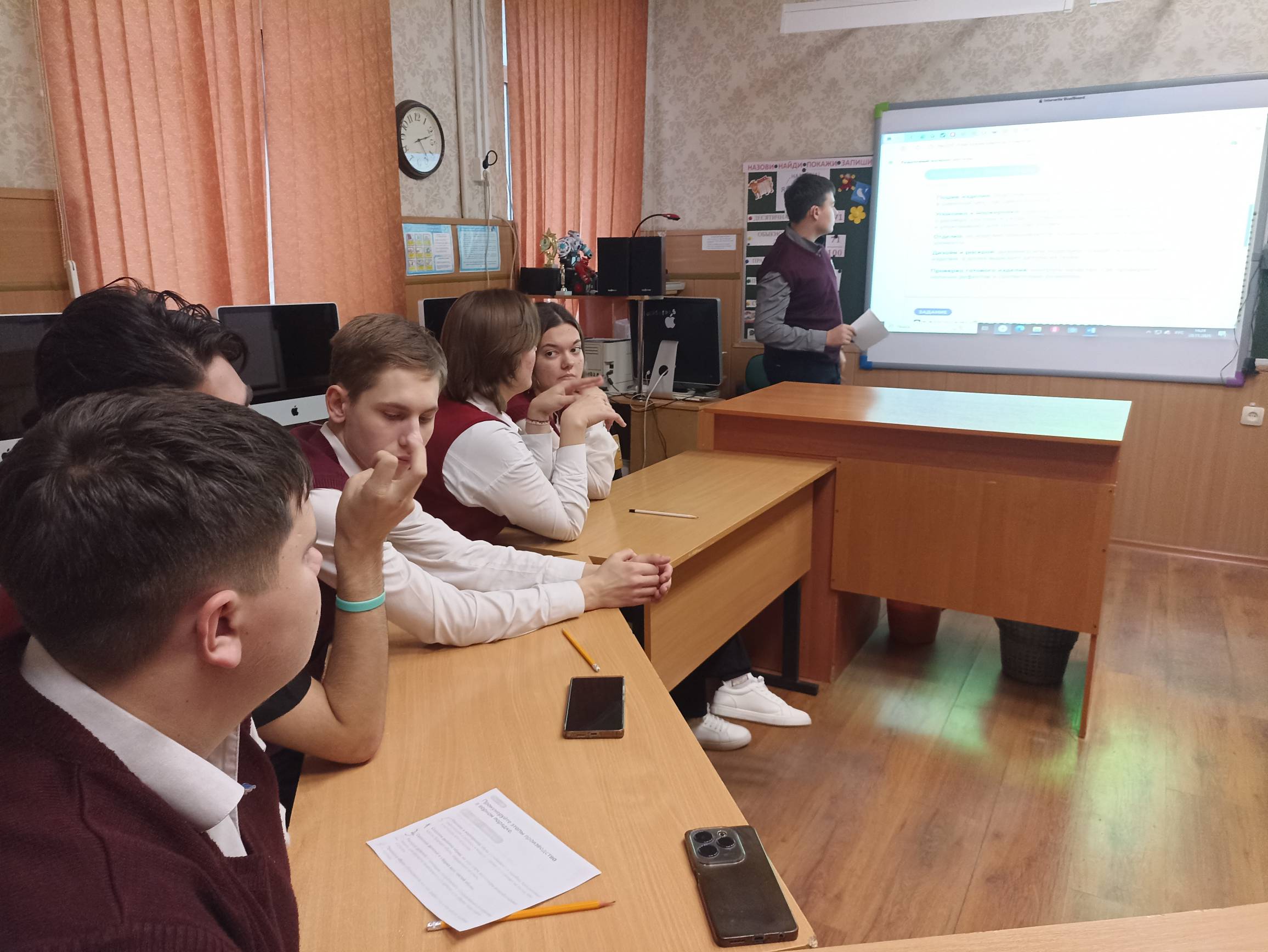 В ходе занятия обучающиеся обсудили, почему лёгкая промышленность является важной отраслью для страны, за счёт чего она развивается. Посмотрели видеоролики по теме и познакомились с профессиями отрасли, обсудили, какими качествами и способностями должны обладать люди этой сферы. Работая в группе, старшеклассники выделили этапы и определили правильный порядок производственных процессов текстильного, швейного, обувного цехов, а также подразделения контроля качества.